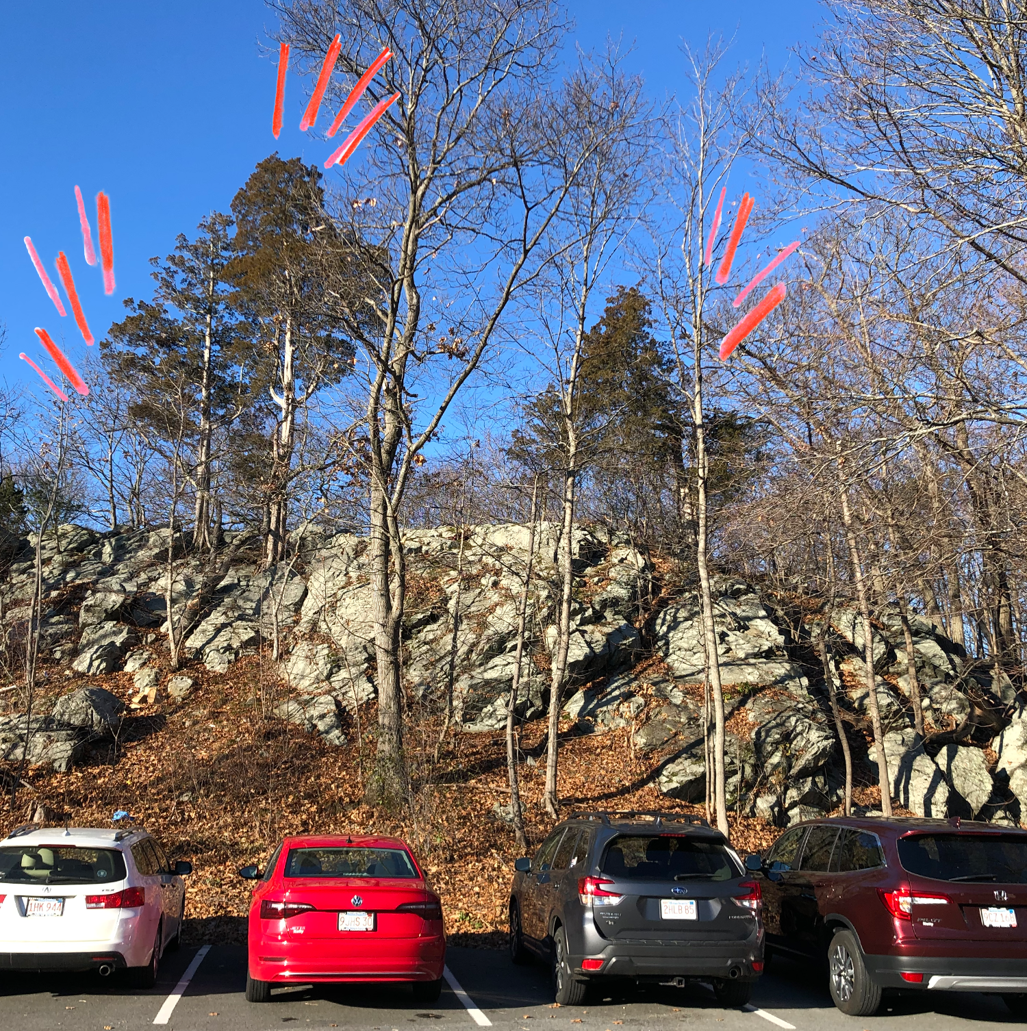 Now that I’ve been walking and jogging the area, I also have some natural landmarks (many little clumps of woods and granite and a few good hills with views) that I like to visit. It isn’t terribly cold, but I’m bundled up because I freeze if its less than 70 degrees outside.